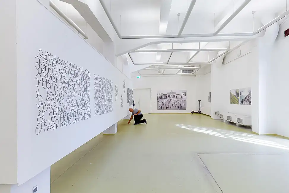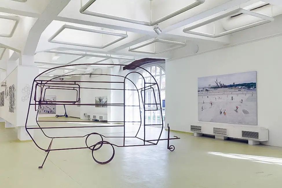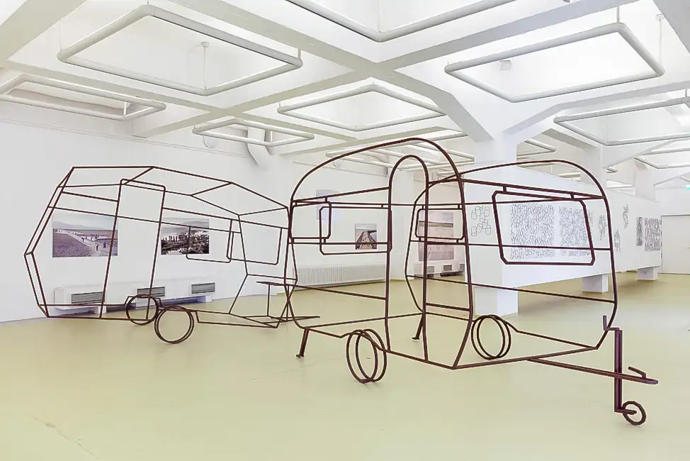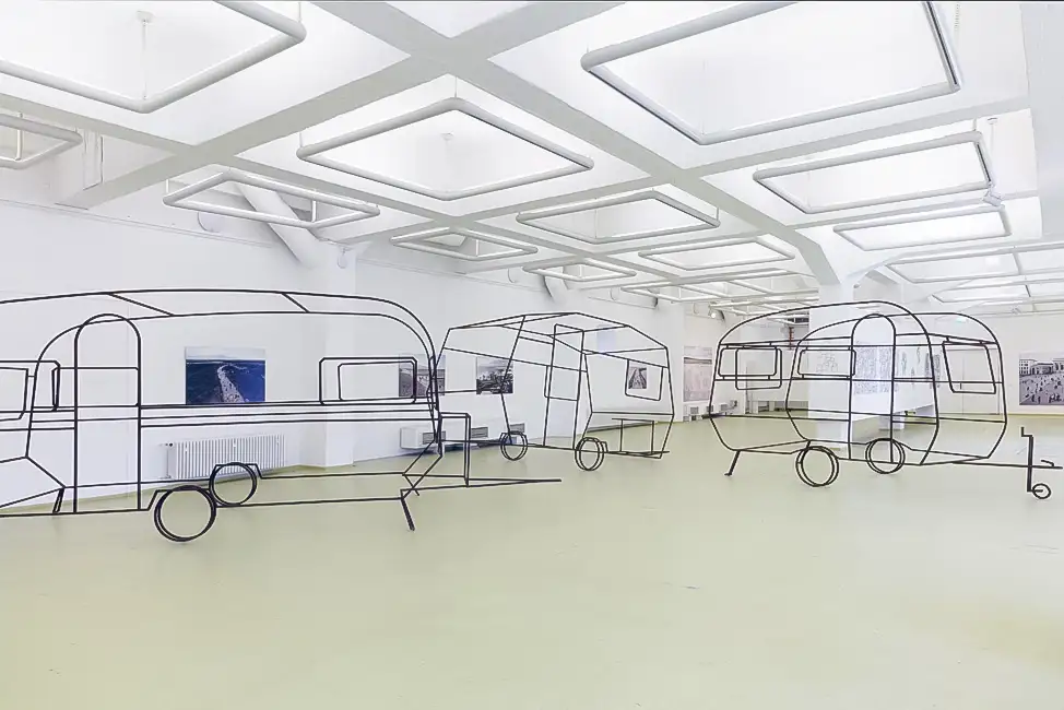 Lebensgroße Wohnwagensilhouetten – filigrane Raumzeichnungen aus rostigen Metallstäben – thematisieren das Spannungsfeld zwischen Mobilität und dem Bedürfnis nach Geborgenheit. Umgeben von Fotografien ferner Sehnsuchtsorte verschränken sich Vertrautes und Fremdes. Auf dem Boden breiten sich Tretroller aus Metall aus: urbane Chiffren der Bewegung, die zugleich Dynamik und Hindernis verkörpern. Sie treten in einen Dialog mit Fotografien ikonischer Plätze großer Metropolen, Orte des Sehens und Gesehenwerdens.